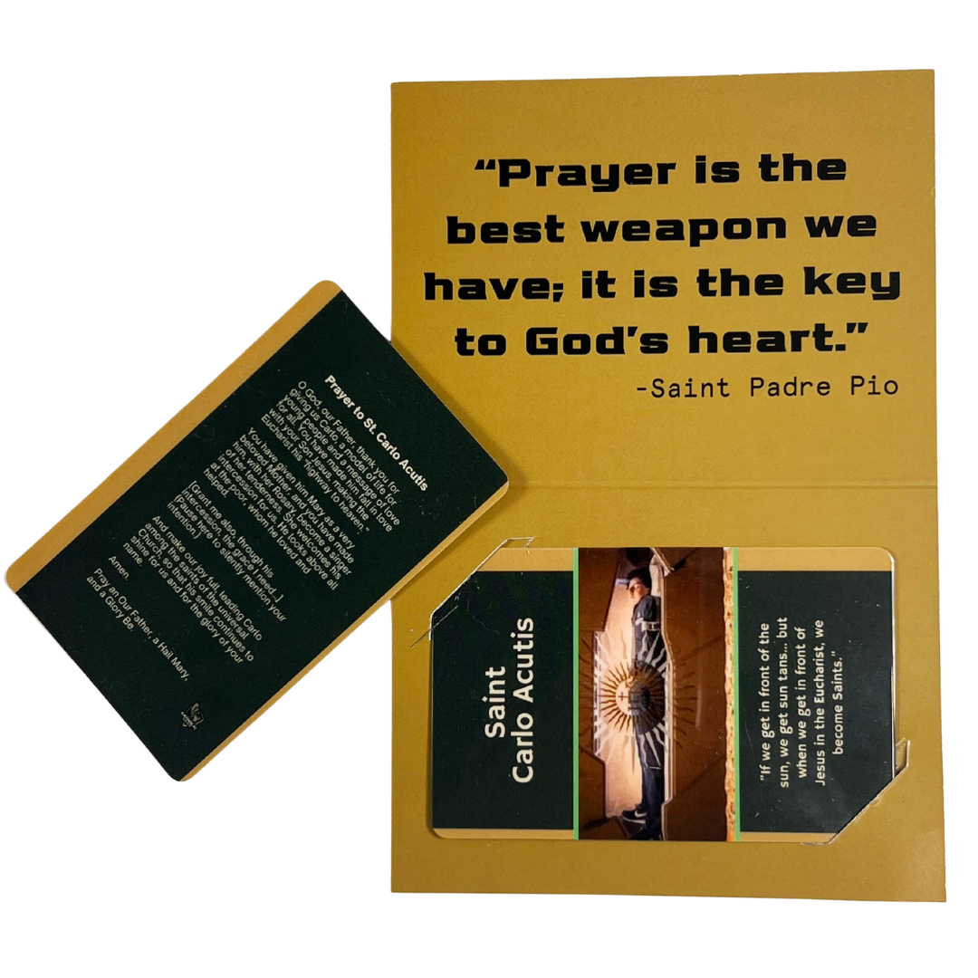 A pocket-sized, durable prayer card honoring St. Carlo Acutis. Clean layout, rugged finish, and convenient to keep with your Combat Rosary™ wherever the battle takes you. Included on the card is a Prayer to St. Carlo Acutis.